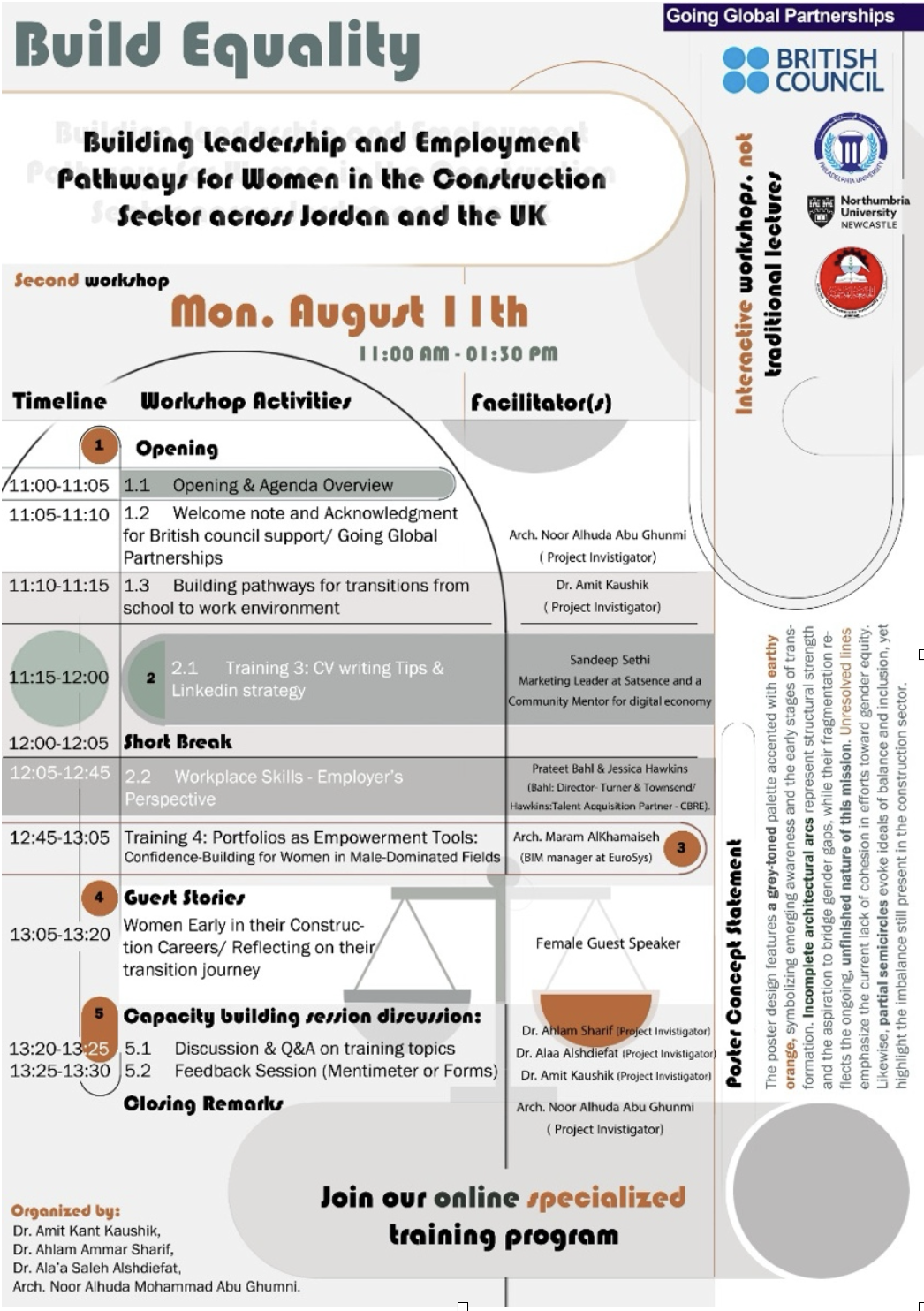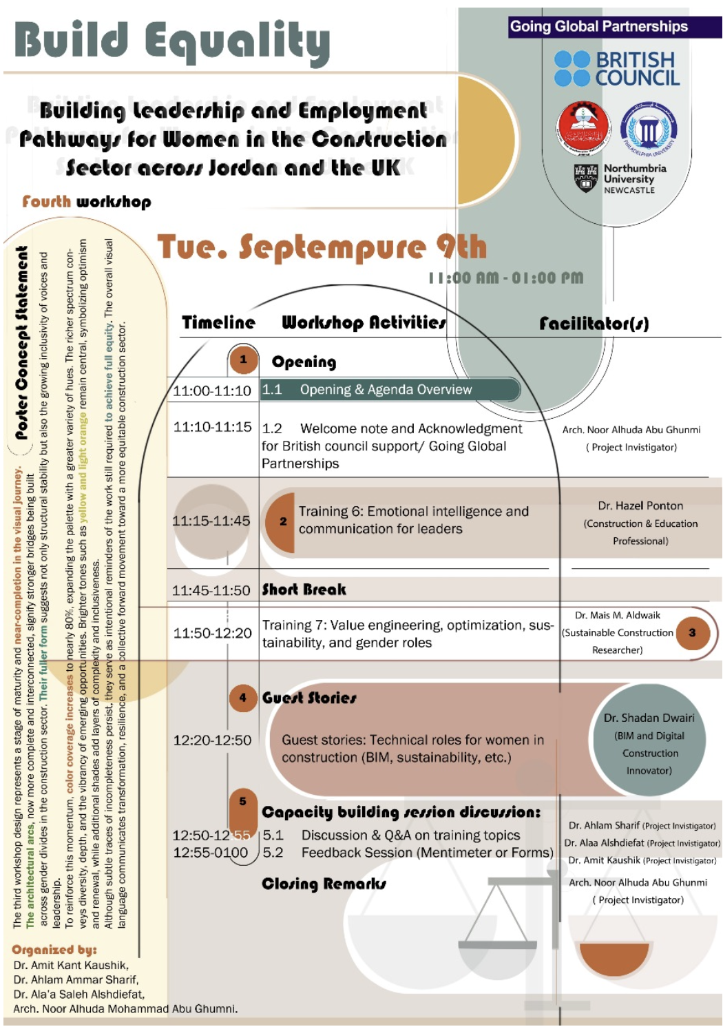 BUILD Equality is a British Council-funded partnership between Northumbria University (UK), Hashemite University, and Philadelphia University (Jordan). Through 2025, we are delivering transformative workshops, training activities, and peer-learning opportunities to help shape a more inclusive future for the construction sector.